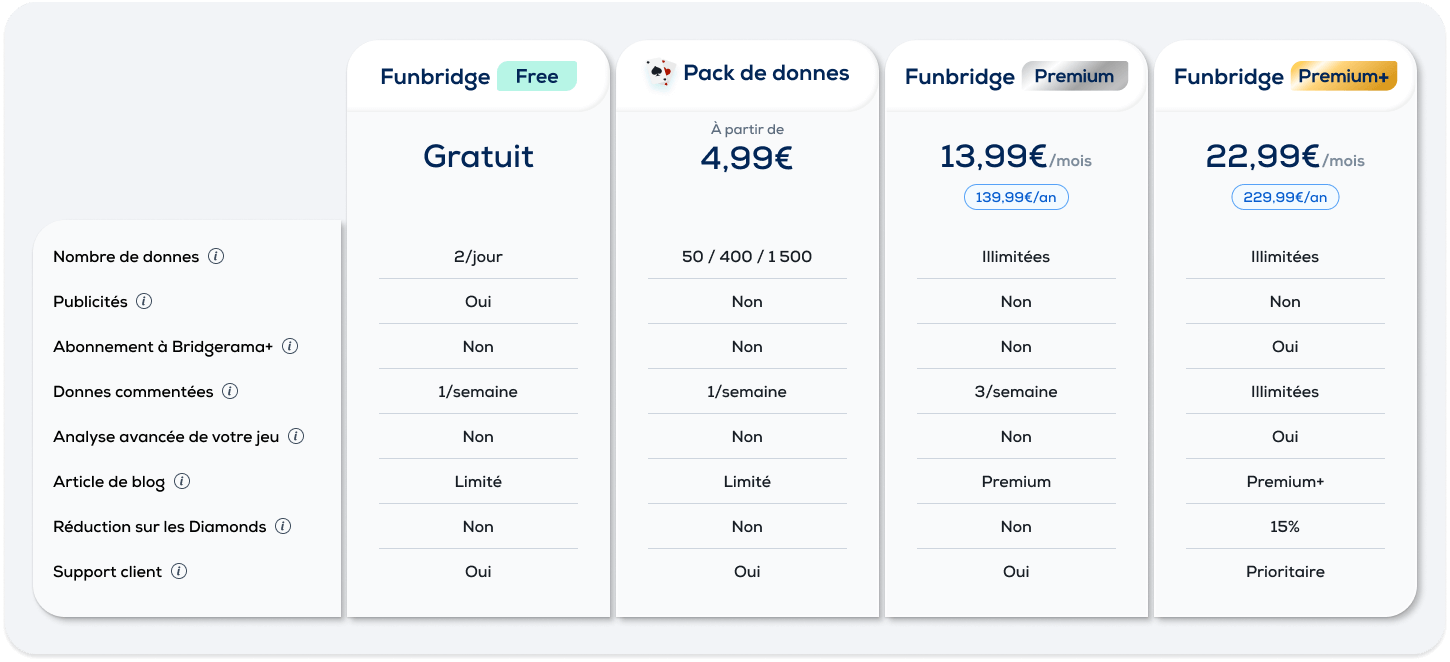 Jouer sur Funbridge sans rien dépenser, c’est possible ! Différentes formules d’abonnement sont également proposées :