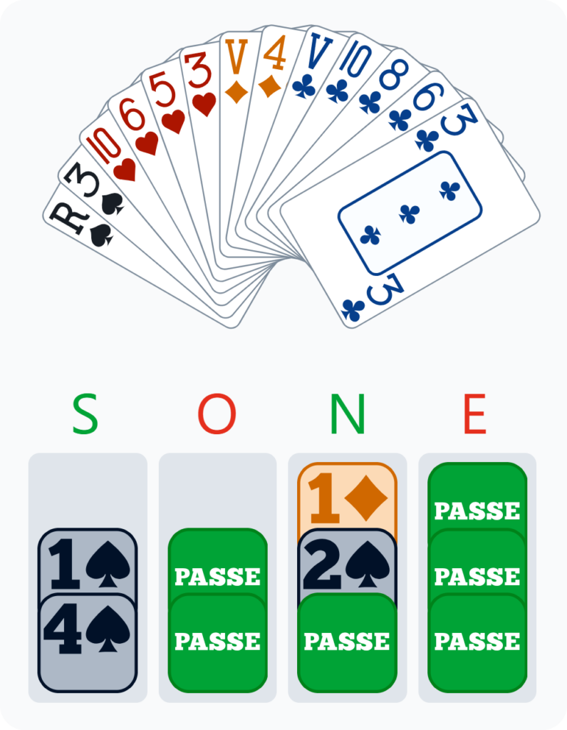 Visiblement, moins vous allez ouvrir de couleurs et mieux vous vous porterez. Par conséquent, vous rejouez le 3 de Cœur, qui confirme à votre partenaire la possession de quatre Cœurs à l’origine.