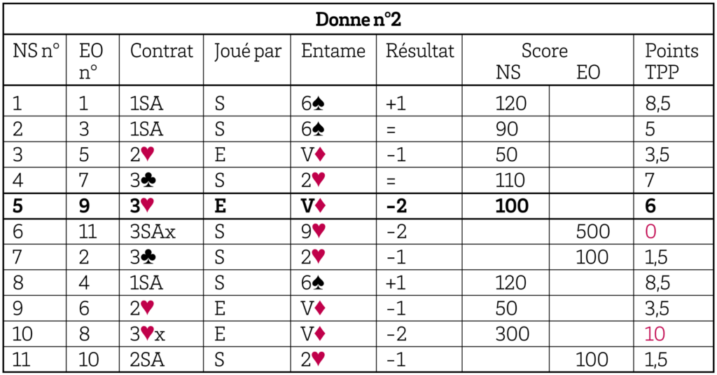 La fiche est facile à lire : les deux premières colonnes repèrent qui a joué contre qui au fil du temps. Les colonnes suivantes indiquent successivement le contrat, le déclarant, l’entame, le résultat et le score obtenu, selon le cas, par les Nord-Sud ou les Est-Ouest. La dernière colonne est plus intrigante : y figure le nombre de points « de tournoi par paires » acquis par la paire Nord-Sud sur la donne. De quoi s’agit-il ?