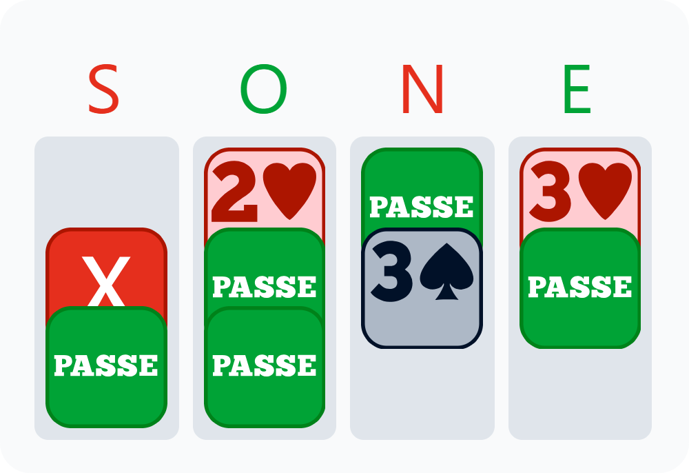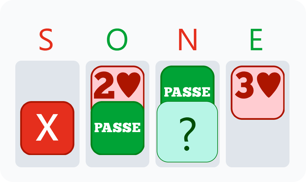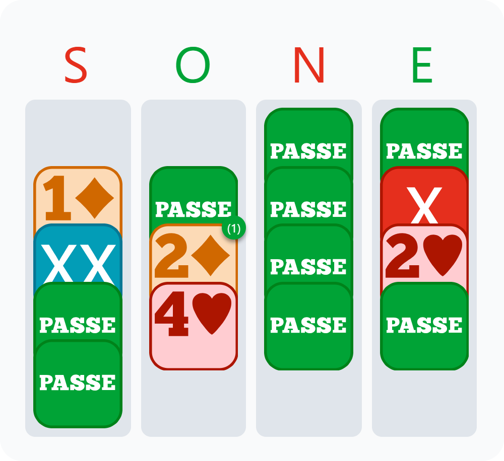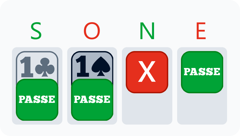 L’adversaire de gauche est intervenu à 1♠ et Andrea a fait un contre Spoutnik, montrant au moins quatre Cœurs. L’adversaire de droite a passé.