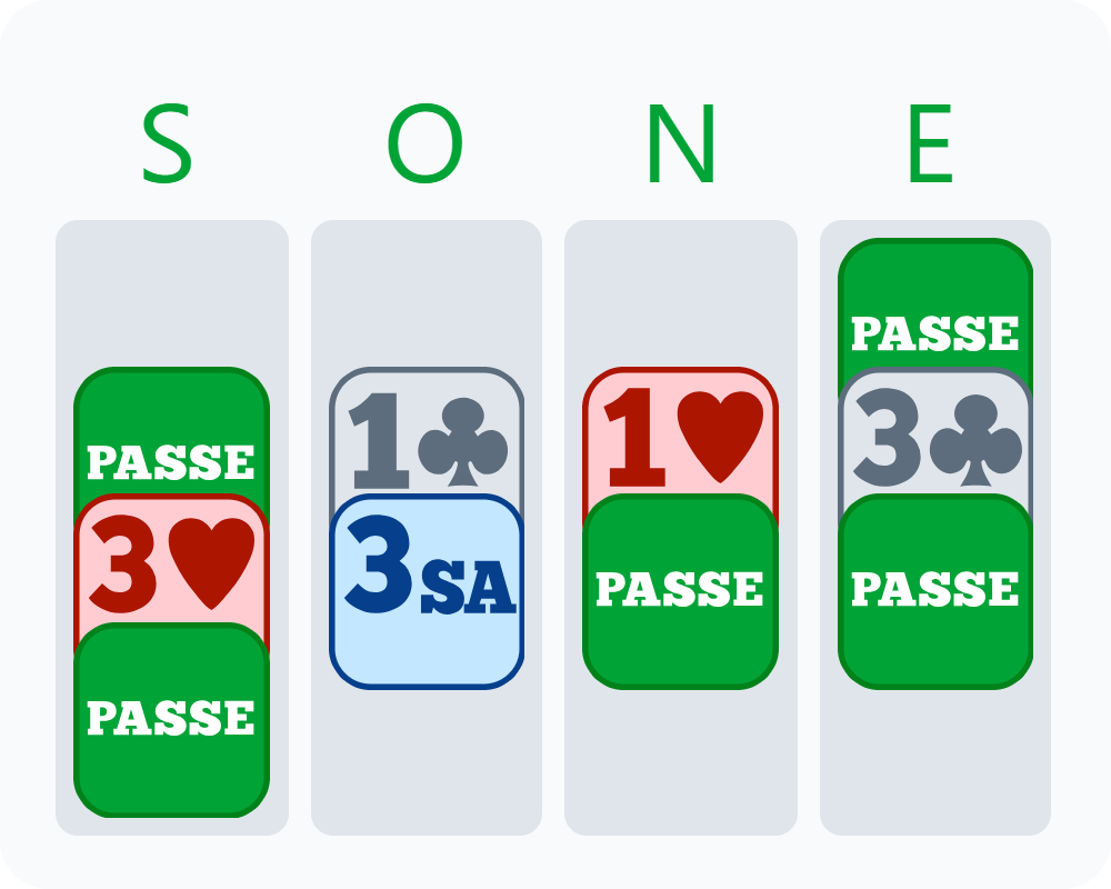 Lorsqu’elle a décidé de passer, nous nous sommes retrouvés à jouer dans une des couleurs adverses, avec un fit 4-2. Résultat : -200, alors que 3SA gagne avec le bon plan de jeu.
