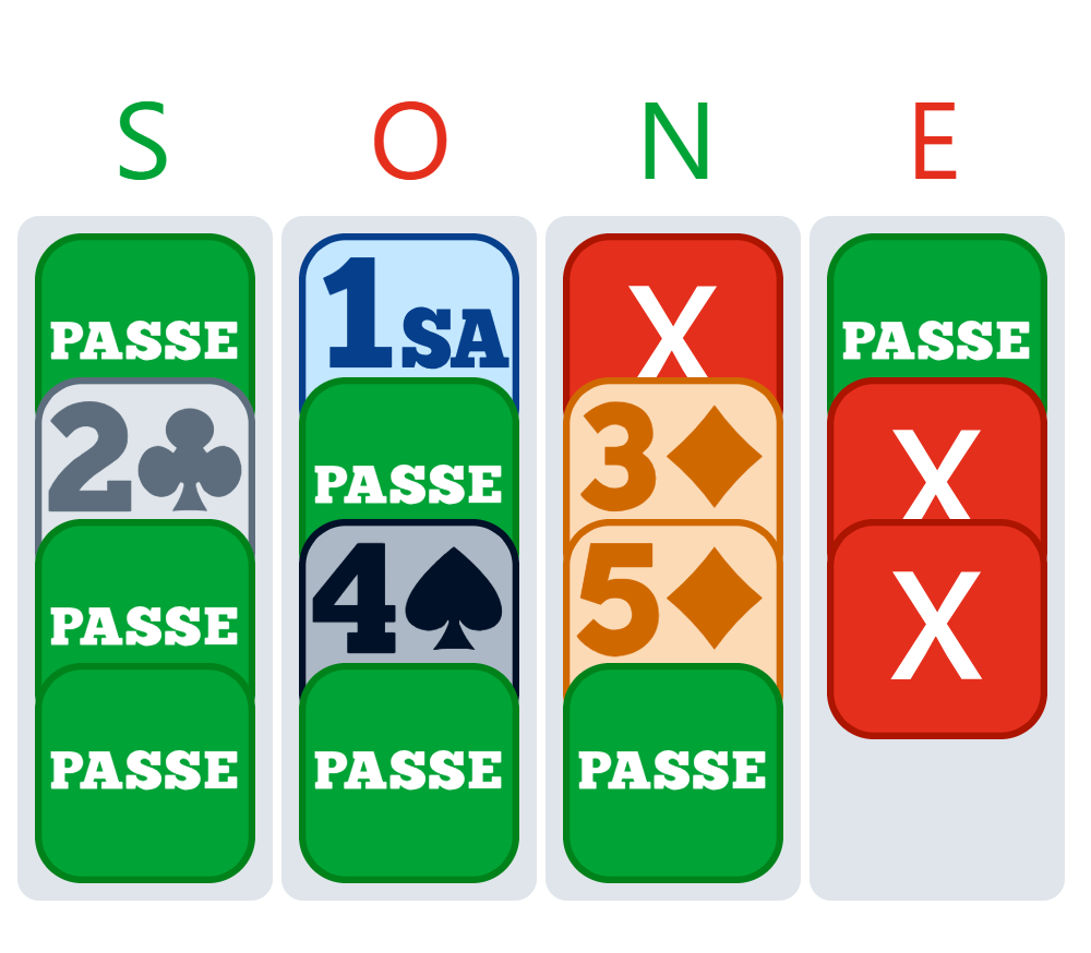 Sur 1SA vulnérable à sa droite, Nicolai estime qu’il peut battre le contrat avec ses 7 levées visibles et contre punitif. Est passe, espérant gagner le contrat avec ses 7 points.