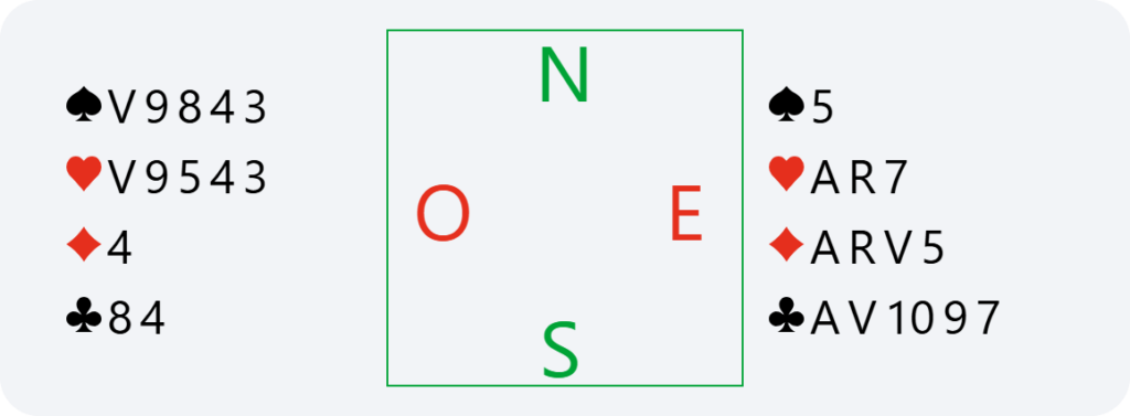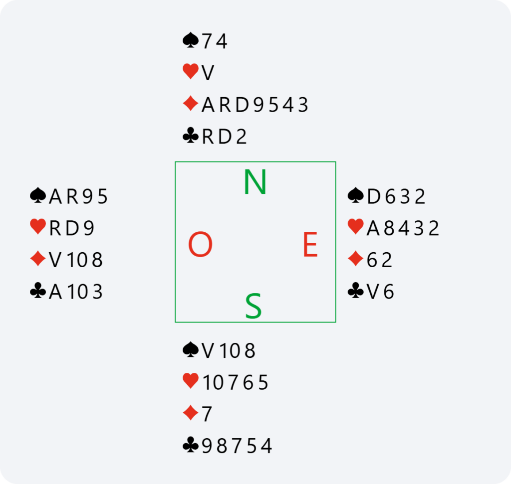 Dans les deux cas, je commence par l’As de Carreau, en espérant une indication de distribution. Nord joue le 9, Sud le 7. Comme ils utilisent la parité inversée, je comprends que les Carreaux sont probablement 5-3.