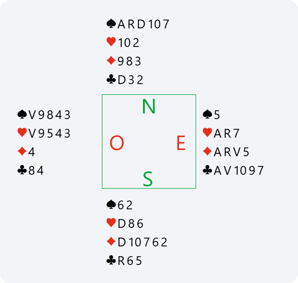 Nord entame As de Pique suivi du Roi, que j’ai dû couper avec le petit Cœur du mort. Ensuite, il fallait faire très attention au jeu de la carte.