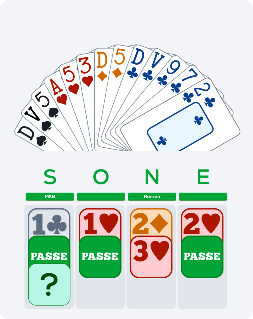 Quand le Contre est l’enchère la plus fréquente, le cue-bid lui montre la courte à Cœur. Je n’ai donc pas mis 3SA avec mon As blanc, car cela supposerait de faire neuf levées sans redonner la main ! J’ai donc dit 4♣ naturel, sur lequel Romaric a répété ses Carreaux.