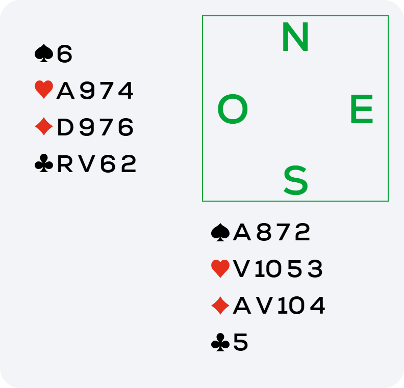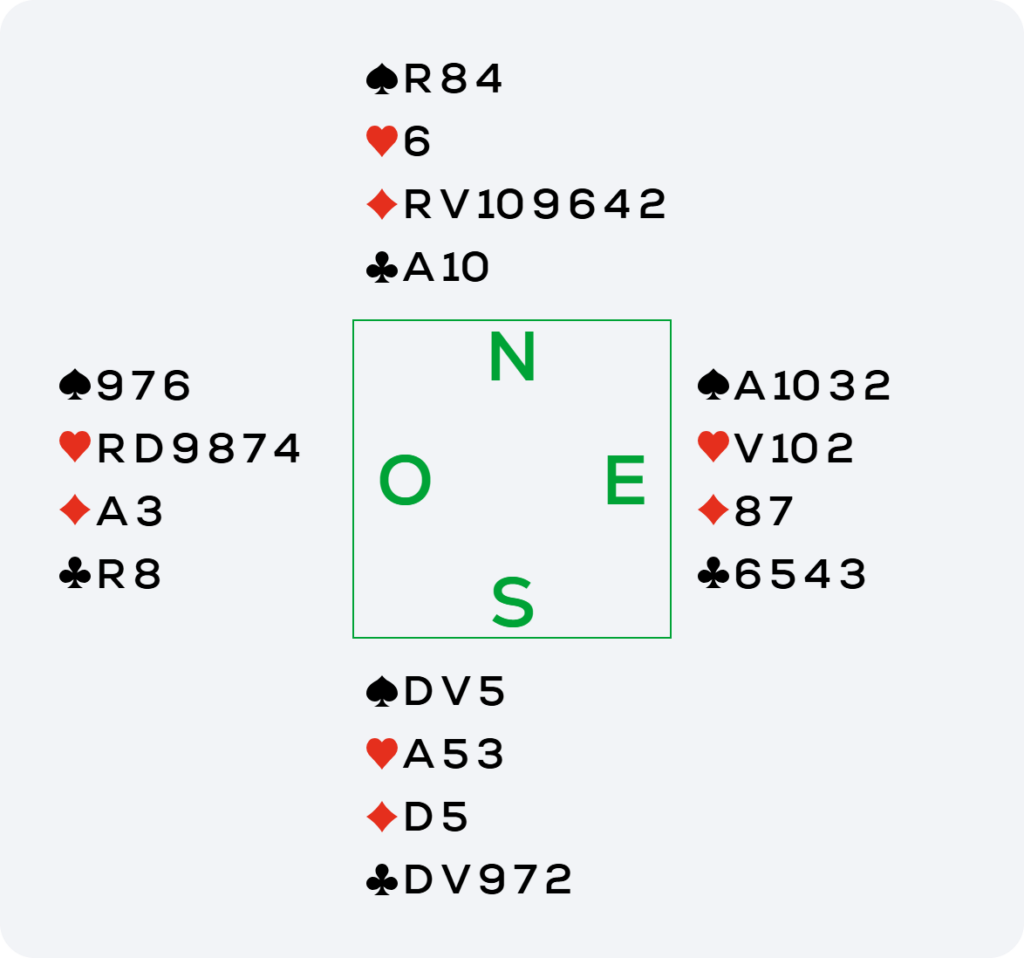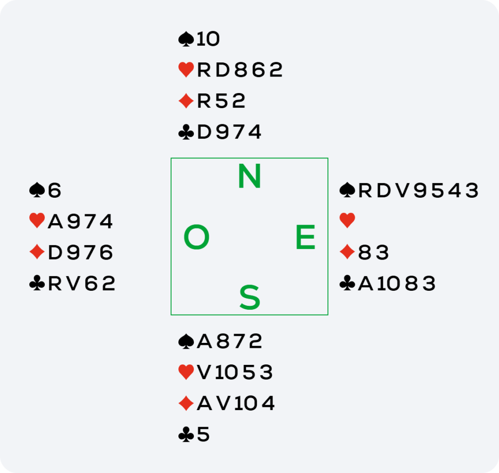 Contre 4♠, j’entame mon singleton Trèfle, pris du Roi en Ouest (le 4 chez Romaric et le 3 en Est). Le déclarant tire ensuite l’As de Cœur sur lequel il jette un Carreau, avant de jouer Pique.