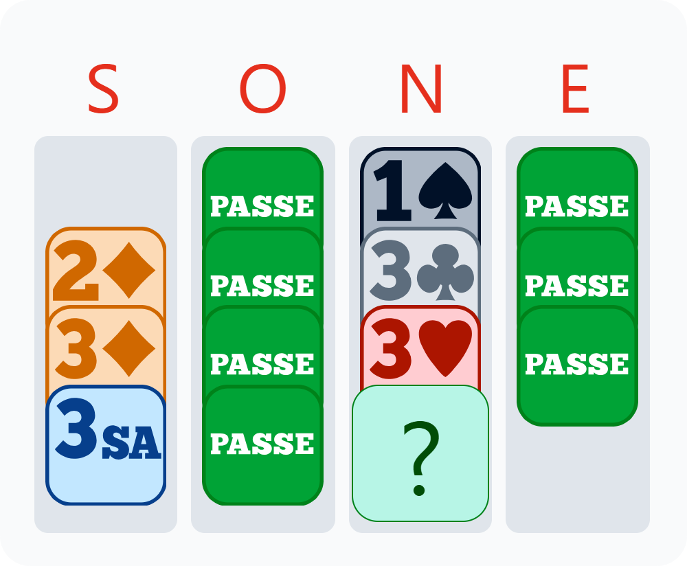 Je finis par dire 1SA, et la séquence se poursuit : 2♥ à gauche, et 2SA texas Trèfle en face (rubensohl).