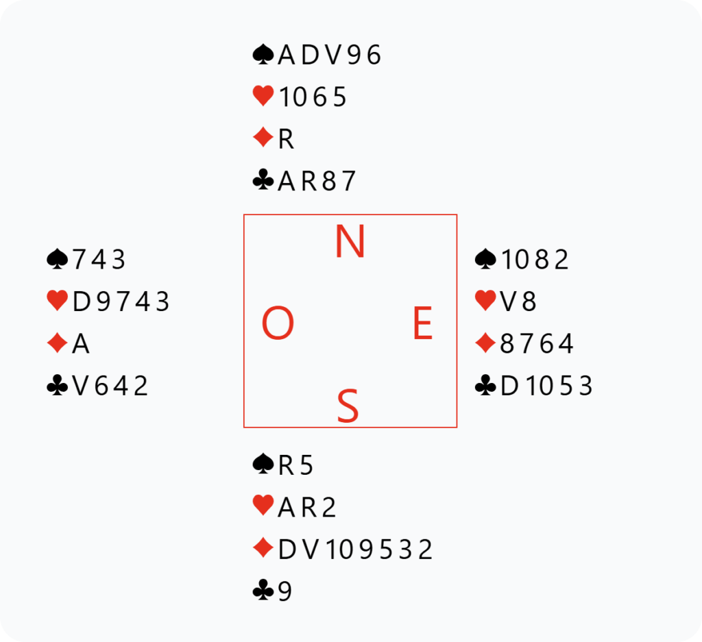 Clément marque un tempo avant de rejouer Trèfle : je décide donc de passer le Roi, car à la vue du mort, avoir l’As est une bonne source d’hésitation. Je fais mon Roi et rejoue Pique vers le mort en croisant les doigts pour une bonne répartition de la couleur… et c’est gagné ! 10 levées, malgré un maniement bien hasardeux ! Les quatre jeux :