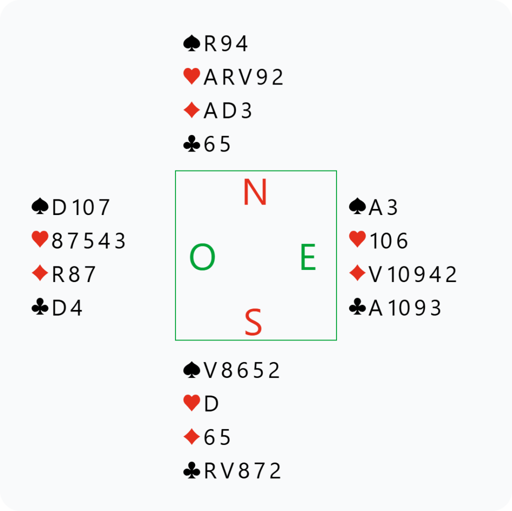 Voici la main d’Anaïs en Nord. Après avoir fait un bicolore cher atténué (3♣ démarre à 16 points), elle entend 3♦ qui montre un bel unicolore. Elle décide de vérifier l’arrêt Cœur avec la 4e forcing, et voit que je tiens la couleur.