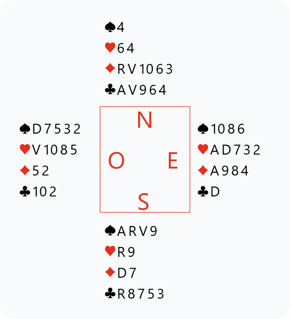 J’ai mis 6♥ plutôt que 6♦ car avec RDV de Coeur et en étant quasi certaine de trouver l’As en face je n’étais pas inquiète, mais une autre joueuse a dit 6♦ dans la même situation et c’est probable que ce soit mieux joué !