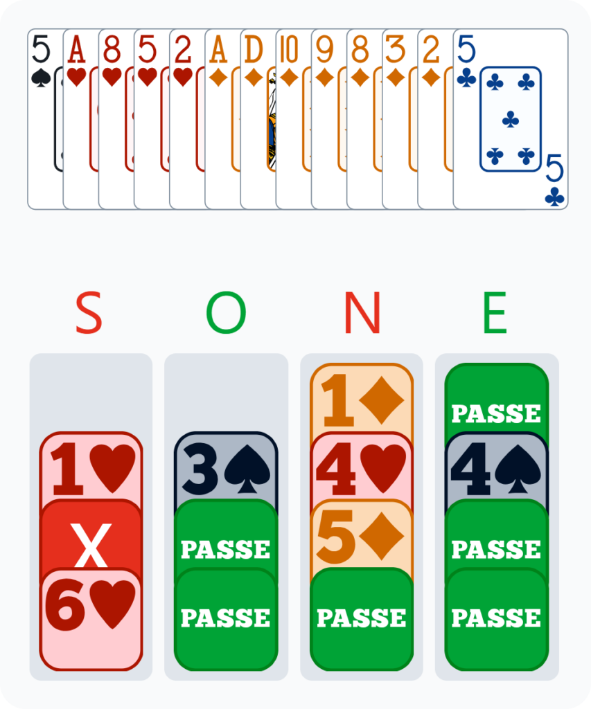 Mais quand les enchères lui reviennent à 4♠ contré, il lui faut prendre une décision : passer sur le contre ou surenchérir, en choisissant à quel atout.