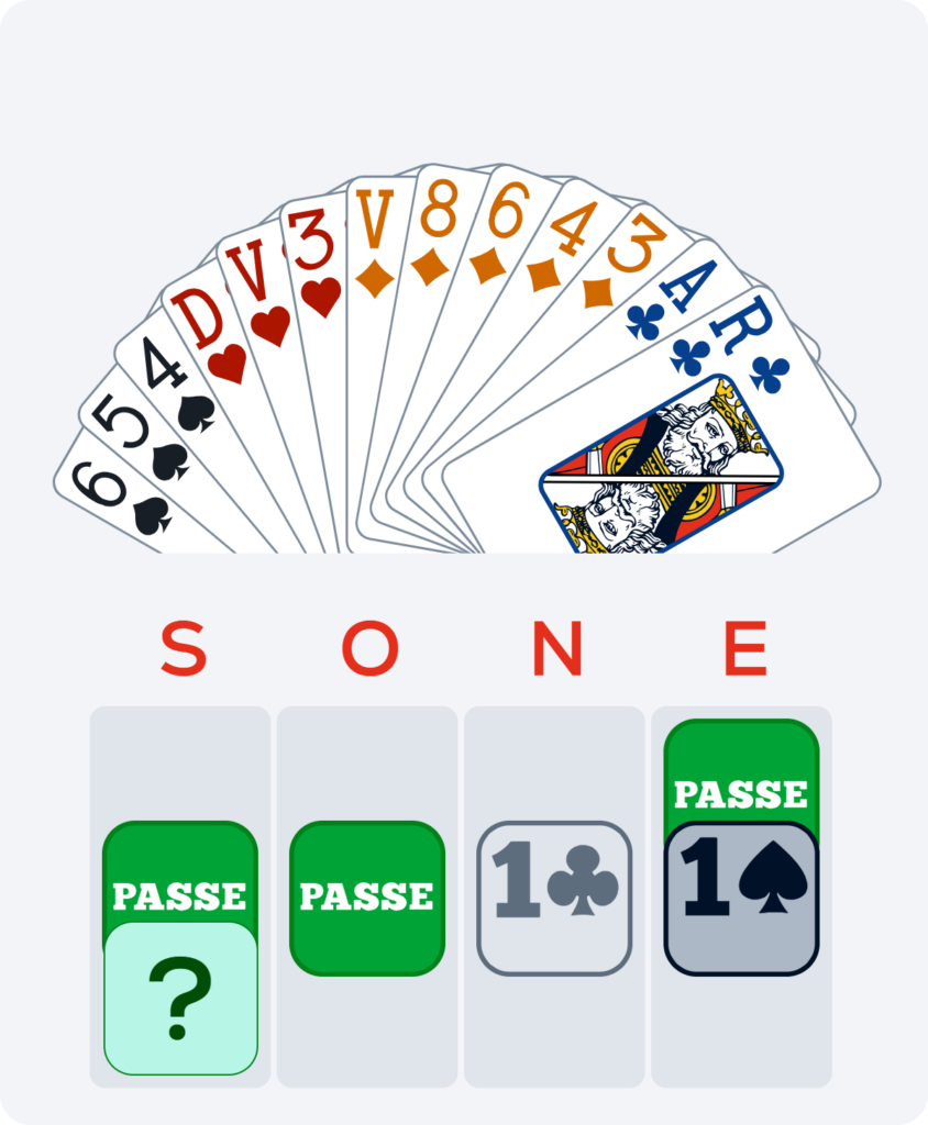 Je détiens 11 points et 5 Carreaux, mais ma main comporte 8 perdantes et des couleurs de mauvaise qualité. Je choisis donc de passer.