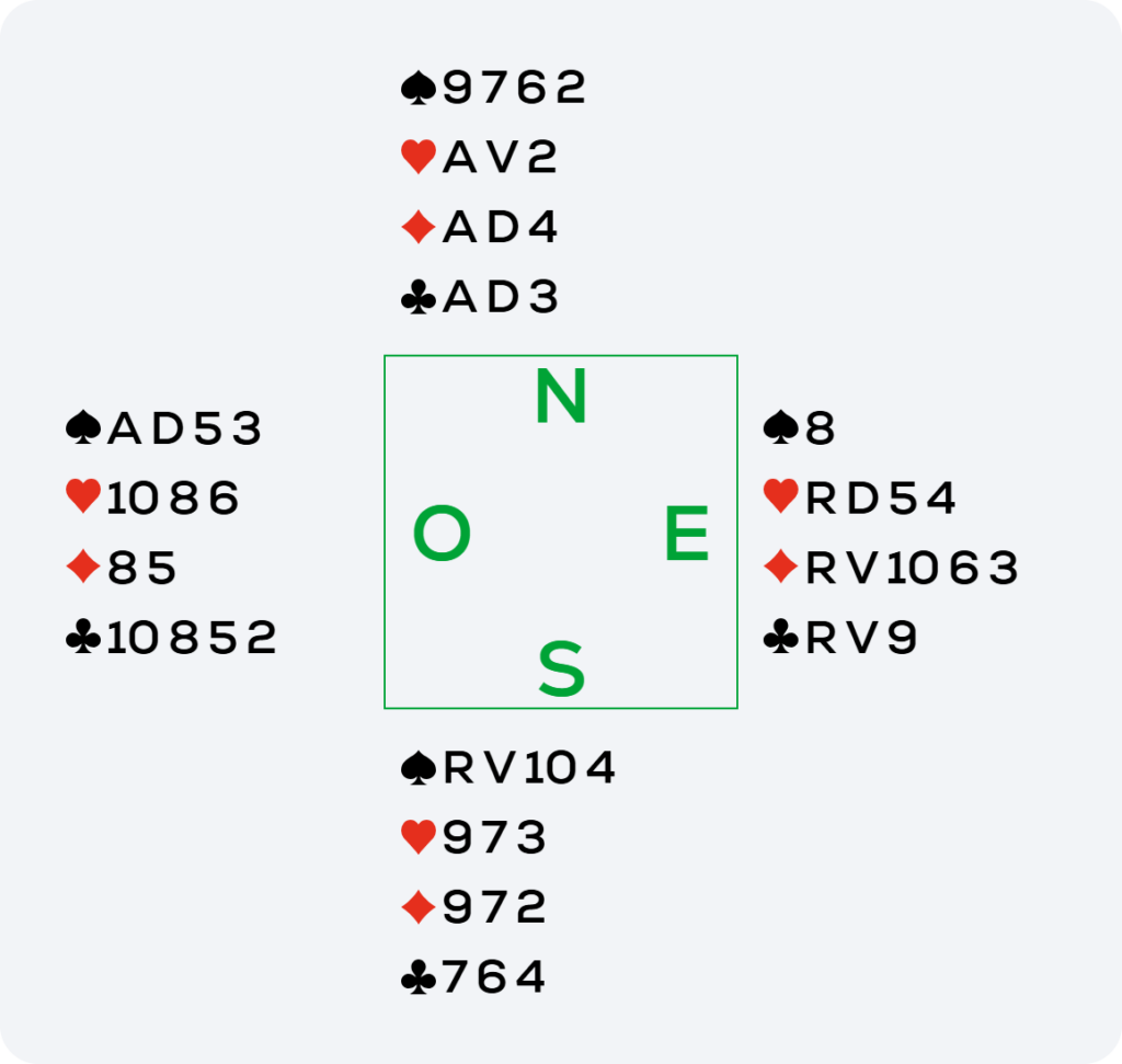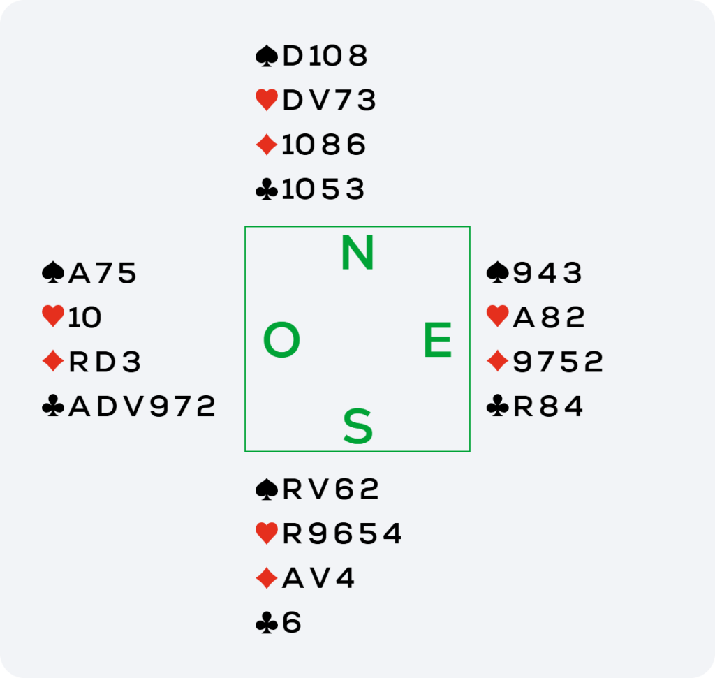 Puis l’As de ♦ et l’impasse à ♦ permettent de prendre 4 levées dans cette couleur. À ce moment-là, Est est obligé de défausser soit la Dame de ♠, soit un autre ♥, me donnant dans les deux cas une chance de faire une levée supplémentaire dans l’autre couleur.