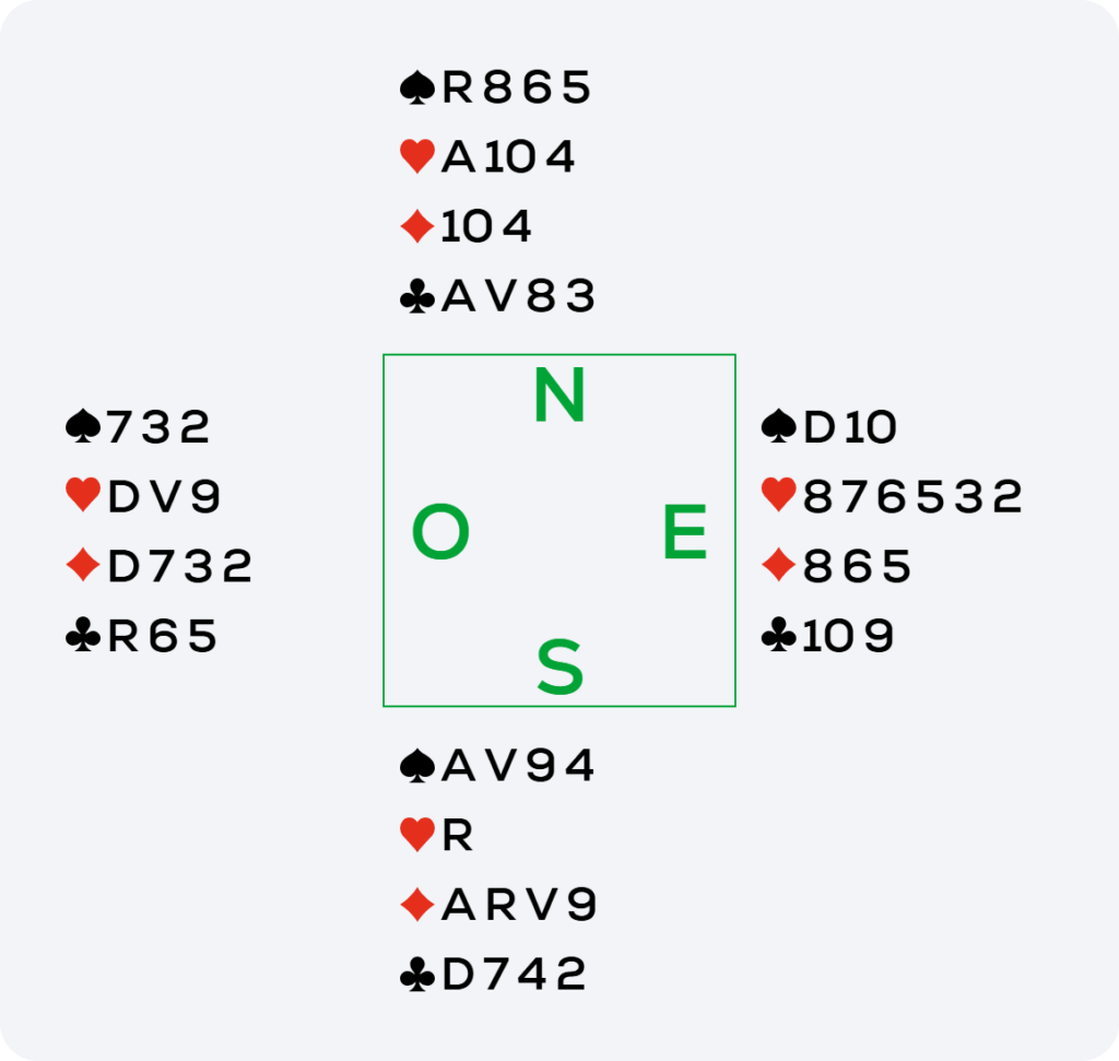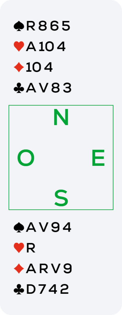 Est entame du 2 de ♥ vers le 10 du mort, le Valet et la Dame.