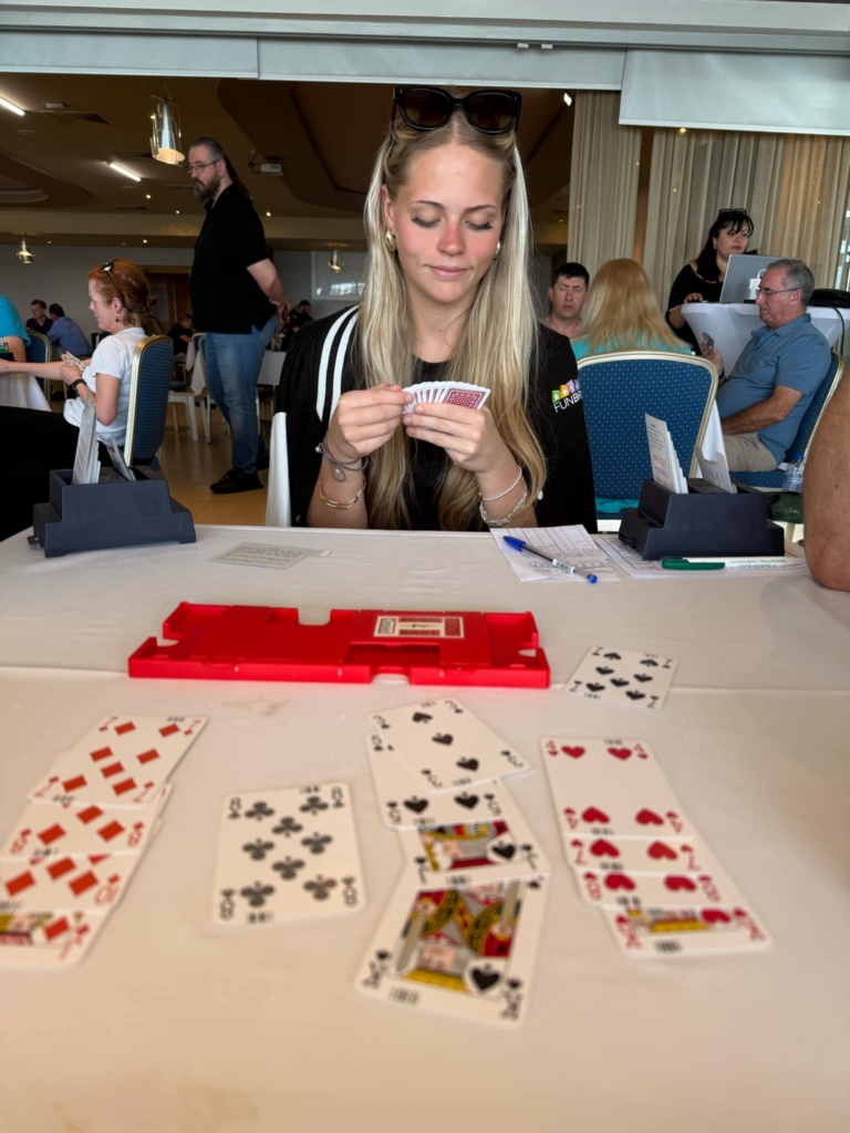 Ella et moi avons eu une journée difficile, mais grâce à un dernier tour extraordinaire, nous avons terminé juste au-dessus de 55%, après avoir obtenu une moyenne de 58%. Andrea et Nachiketa se sont également améliorés et ont fait 54% sur leur séance, ce qui porte leur moyenne à 50%. Nous avons tous beaucoup apprécié cette journée en raison des activités amusantes que nous avons pratiquées avant de jouer et des adversaires très sympathiques à la table de bridge. Nous attendons avec impatience la journée de demain et espérons faire encore mieux. 💪