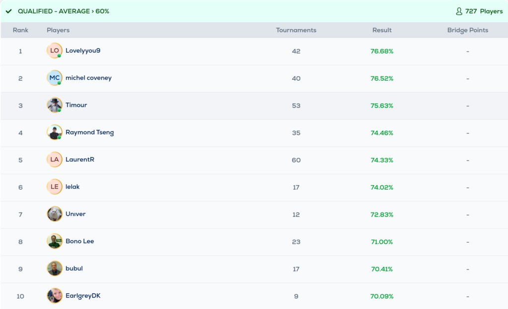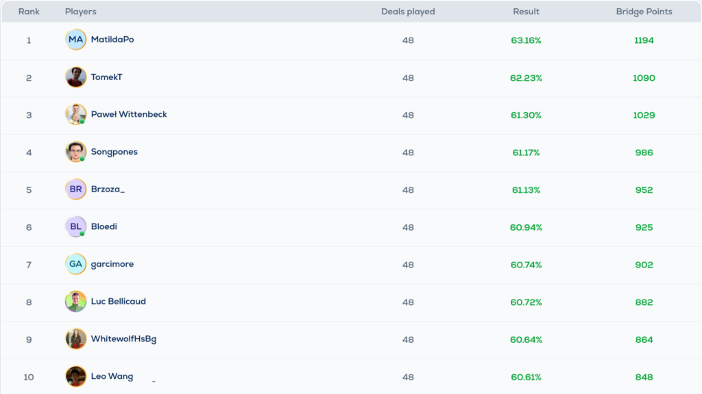 Certains noms bien connus de Funbridge se sont hissés aux avant-postes, frôlant la victoire sans toutefois l’emporter. Mention spéciale à l’une de nos Stars Funbridge, Luc Bellicaud, (376ᵉ au classement live BP), qui réalise une superbe performance et termine à la 8ᵉ place avec 60,72%.
