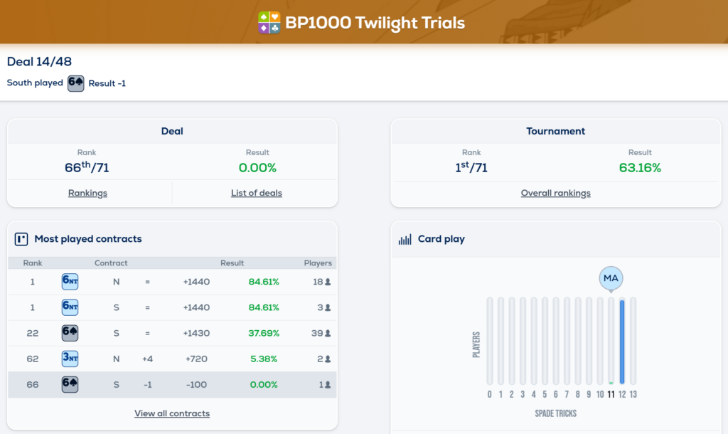Un énorme merci à tous les participants 🧡 ! Vous avez fait de ce BP1000 Twilight Trials un vrai feu d’artifice de bridge ✨. On espère que vous vous êtes autant régalés que nous à suivre vos exploits !
