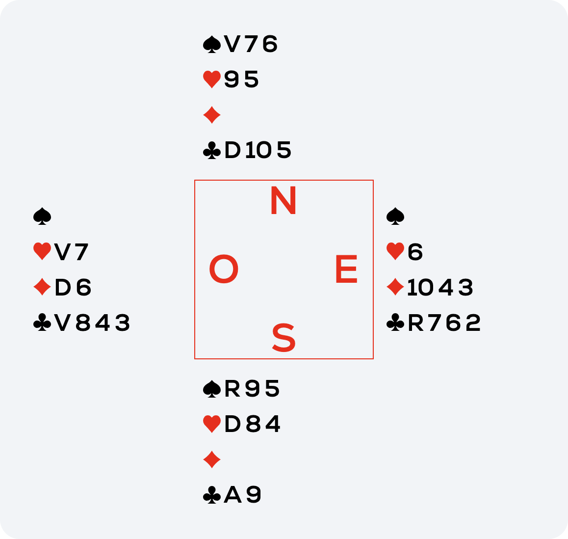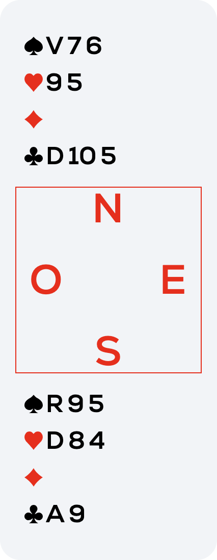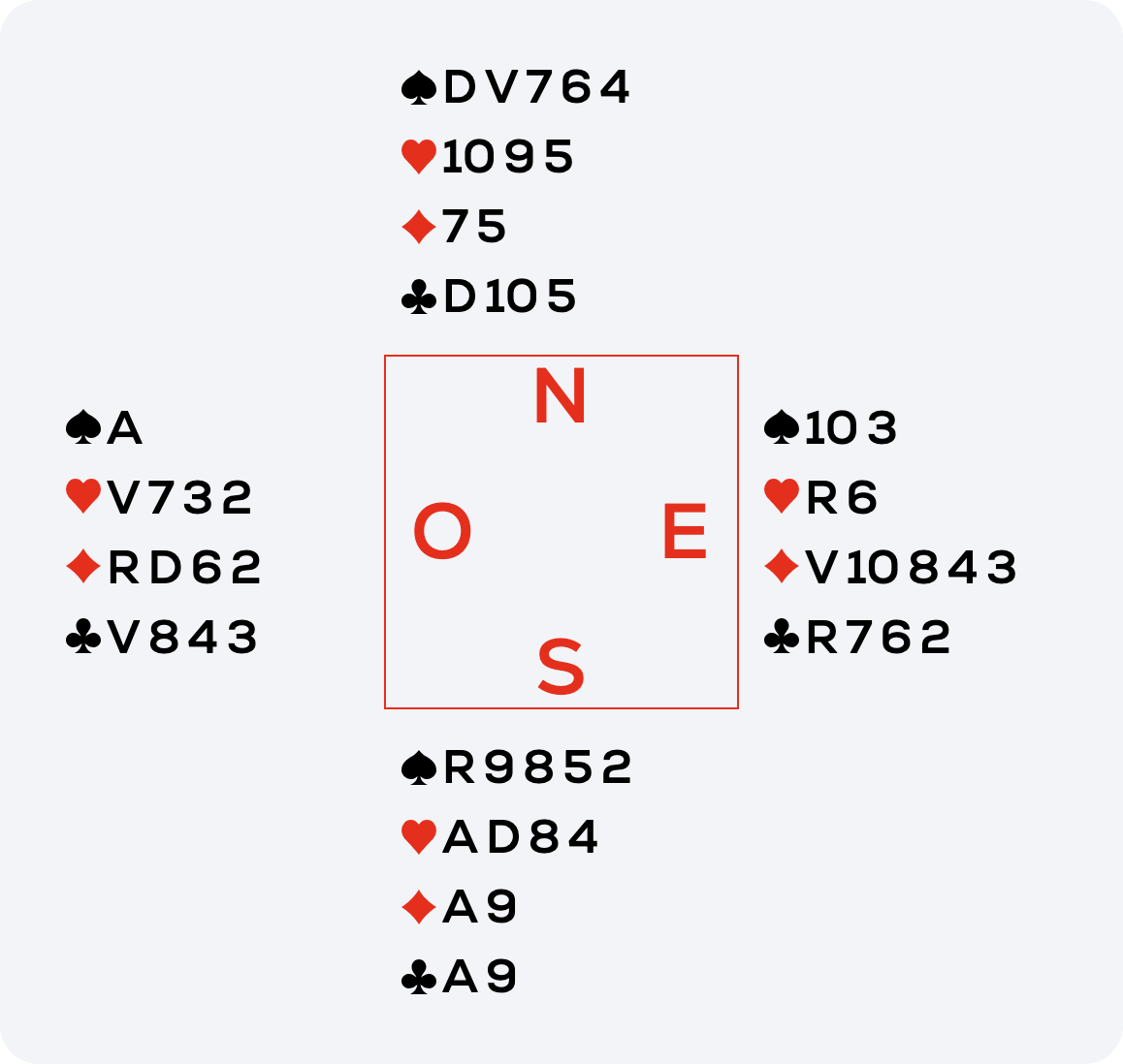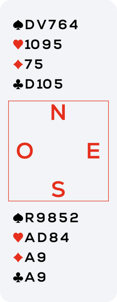 À partir de la position ci-dessus, j’ai joué un Cœur au mort vers ma D♥ (Est a fourni petit), puis un autre Cœur qu’Ouest a pris du V♥. Avec seulement des Carreaux et des Trèfles restants, Ouest est ressorti à Trèfle. Heureusement, j’ai joué petit au mort, Est a fourni petit et mon 9♣ a fait la levée ! Ouest avait bien le V♣.
