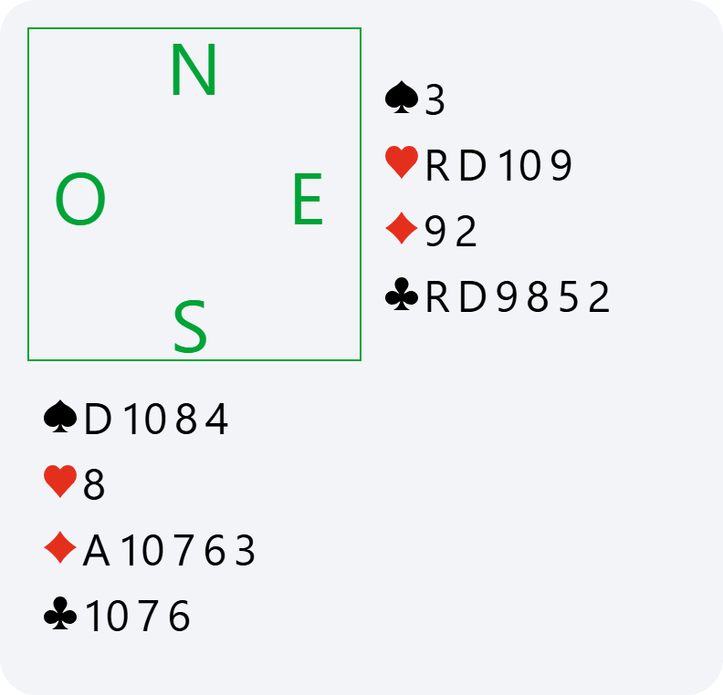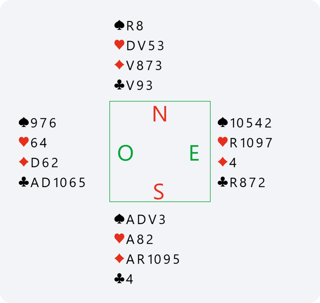 Je sais que le déclarant a As-Dame de Pique minimum et As-Dame de Trèfle probables. Maintenant il me faut savoir s’il a ses points à Cœur ou à Carreau. Le fait que ma partenaire ait rejoué Pique malgré mon appel de Smith me donne l’impression qu’elle n’a pas d’intérêt à plutôt miser sur les Cœurs.