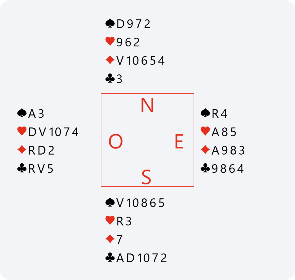 Sur 3♥, Anaïs a très justement annoncé 5♦ avec la connaissance du fit neuvième, la meilleure manche avec pour seules perdantes la Dame de Carreau troisième et l’As de Trèfle.