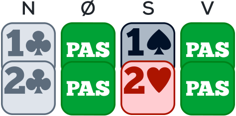 Din makker spiller klør konge ud. Modstanderen stikker den med esset og spiller en hjerter til bordets dame. Han får stikket og spiller 5… Du skal kaste dame. Du har resten af sekvensen (bonden og 10'eren) og inviterer din makker til at returnere farven. Bemærk også, at dette afkast ikke koster noget stik, da du aldrig kan tage mere end 3 stik i , da der derefter vil blive trumfet.