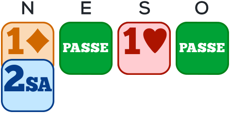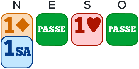 1SA décrit une main sans singleton, sans 4 cartes à ni 4 cartes à , d’une valeur de 12 à 14 H.