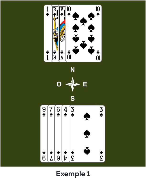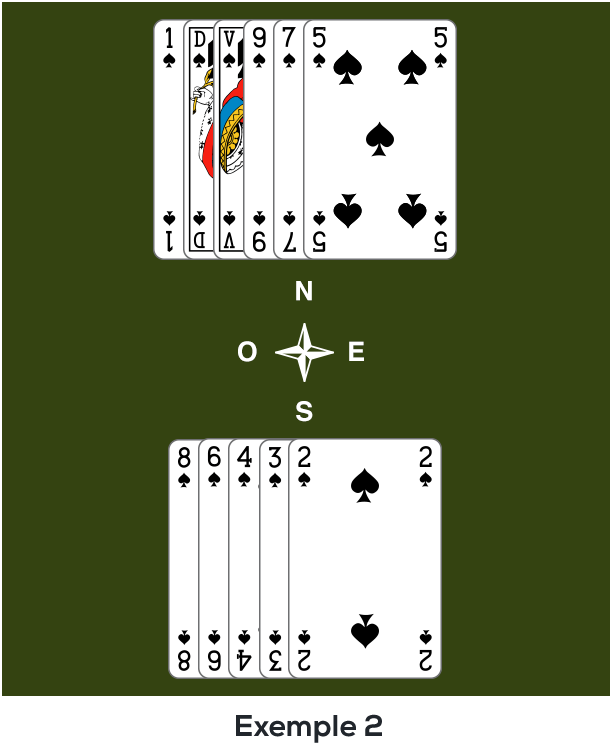 Dans l'exemple 1, vous détenez neuf cartes à Pique, il en reste quatre dehors. La règle vous indique qu’à partir de neuf cartes, il ne faut plus faire d’impasse à la Dame. Commencez par tirer l’As. Si tout le monde fournit, vous aurez statistiquement plus de chances de capturer la Dame en tirant le Roi au deuxième tour qu’en jouant un petit vers votre Valet. Il faut donc tirer en tête.