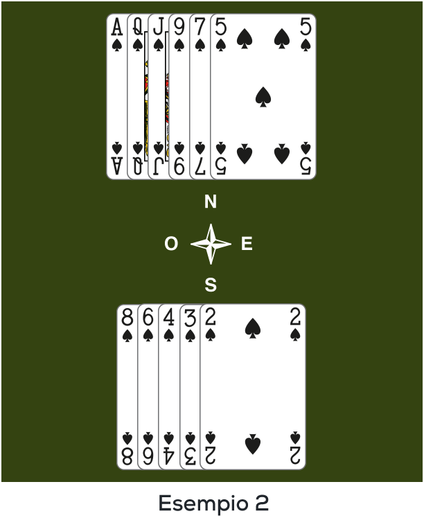 Nel secondo esempio, hai 11 carte nel colore, che significa che gli avversari ne hanno solo 2. Gioca come se il colore fosse diviso equamente tra gli avversari e batti l'onore di testa (con solo 10 carte sulla tua linea, avresti dovuto invece sorpassare il Re).