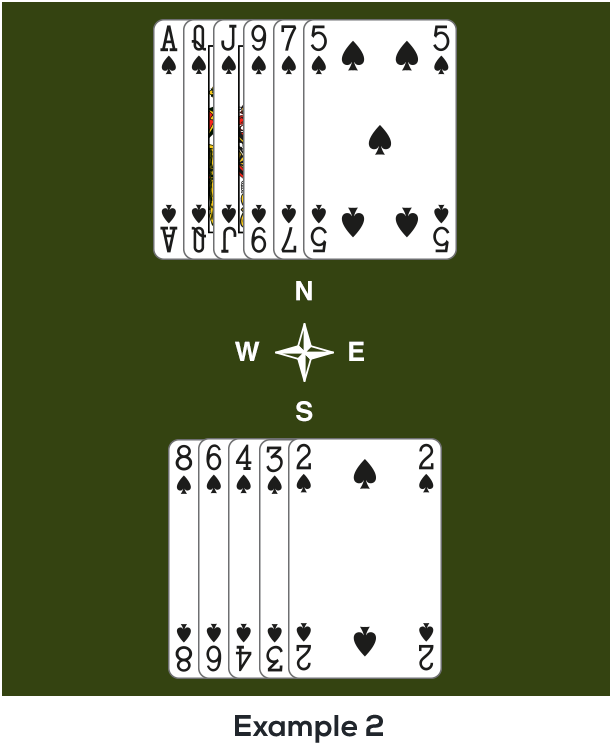 In the first example, you have 9 cards in Spades. There are 4 left. The rule says that from 9 cards, you should not finesse against the Queen anymore. Start by playing the Ace. If everyone follows suit, statistically you will have more chances to pick up the Queen by playing the King on the second round than by playing low to your Jack. You should therefore cash top honours.