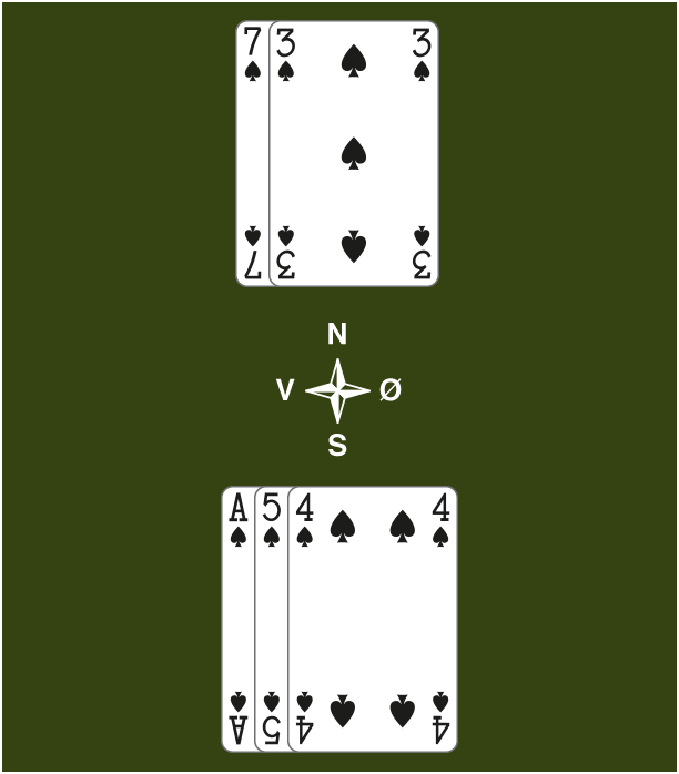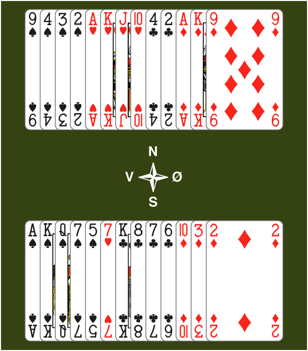 I dette eksempelet, kan Nord legge til 2 fordelingspoeng (1 for den 9. trumfen og 1 for dobbelton i kløver). Syd kan legge til 2 fordelingspoeng pga sin single hjerter.