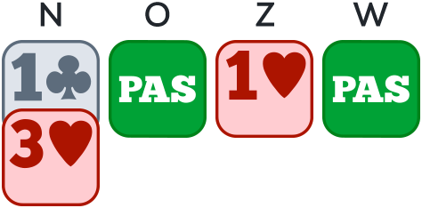 De openaar moet prioriteit geven aan het verhogen van een hoge kleur. Omdat het antwoord slechts een 4 kaart heeft beloofd, mag de openaar alleen verhogen als hij ook een 4 kaart heeft.