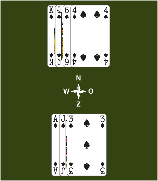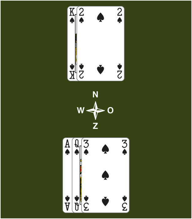 Om je 3 slagen te halen zonder communicatieproblemen speel je eerst de Heer, daarna de Aas en de Vrouw.