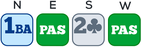 Z obiema starszymi 4, dwie możliwości są prawdopodobne: możesz odpowiedzieć 2BA aby pokazać 4 i 4 (to jest domyślne rozwiązanie na Funbridge’u) albo możesz zacząć od licytowania Kierów 2, (to jest rozwiązanie polecane w module wprowadzenia).