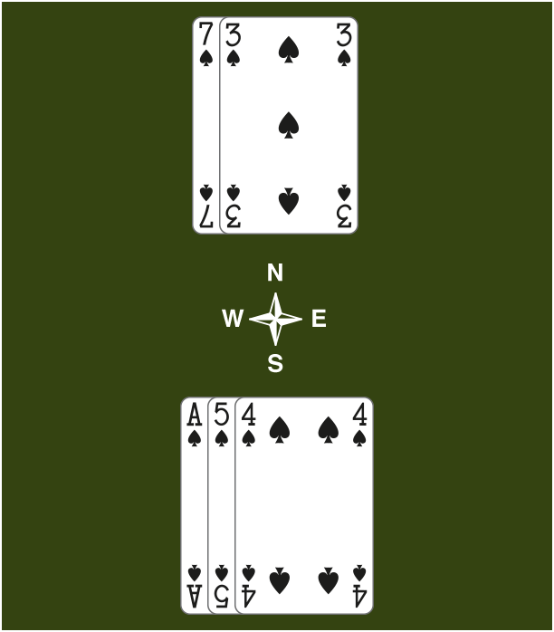 Jeśli E i W mają po 4 karty w kolorze, nie jest możliwe przerwanie komunikacji przeciwnikom (ale w tym przypadku oddasz tylko 3 lewy w tym kolorze). Jednak, jeśli się podzielą 5/3 poprzez wzięcie lewy w trzeciej rundzie izolujesz dwie górne karty trzymane przez stronę przeciwną (które powinny znajdować się po lewej stronie u tego, który zawistował w ten kolor).