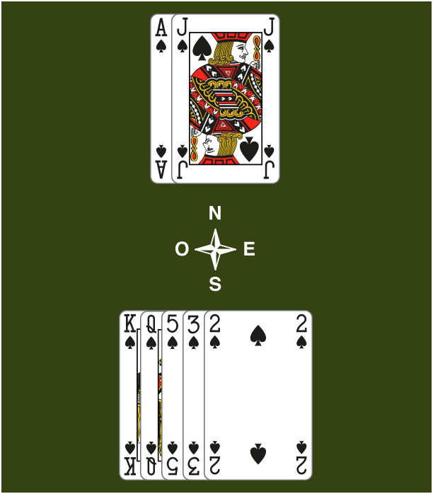O parceiro sai ao Rei de . O declarante deixa passar uma vez, e repete a manobra quando o parceiro continua com a Dama de Espadas. Na terceira vaza de , temos de baldar. Podemos excluir a balda de uma pequena ou de um pequeno , pelo que temos de baldar um pequeno .