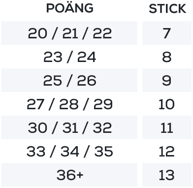 Här är en tabell som visar det antal poäng den starkaste sidan har och hur många stick de behöver vinna: