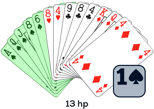Har han högst 11 hp, säger han "pass" och turen går vidare till nästa spelare. Ett möjligt öppningsbud är 1NT, som vanligen visar 15-17 hp och balanserad fördelning (minst 2 kort i alla färger).