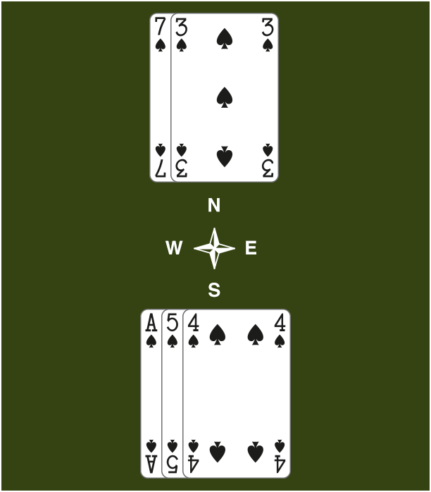 Bu örnekte, Kuzey 2 dağılım puanı ekleyebilir (1 puan dokuzuncu koz için ve 1 puan doubelton trefl rengi için). Güney tek körü için 2 dağılım puanı ekleyebilir.