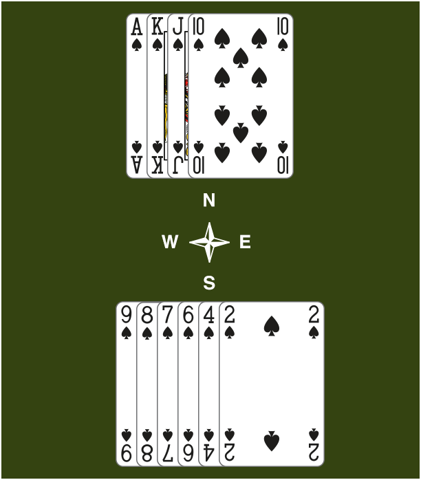 İlk örnekte, Pikte 9 kartın var. Rakiplerde 4 tane. Kural diyor ki, bir renkte 9 kartın varken Dam için empas atmamalısın. As’ı oynayarak başla. Eğer herkes buna uyarsa, ikinci turda Vale’ye doğru küçük oynamaktansa Dam’ı düşürmek için Rua’yı oynamanın şansının daha yüksek olduğu istatistiki olarak doğrudur. Bu nedenle tepe onörleri çekmelisin.