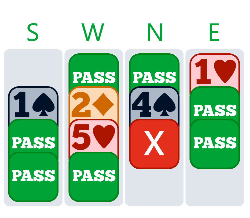 In our auction, West made things harder for herself by not supporting hearts after 1♠. Niels’s 4♠ was a great space-eating bid. West tried to recover by bidding 5♥, which Niels doubled.