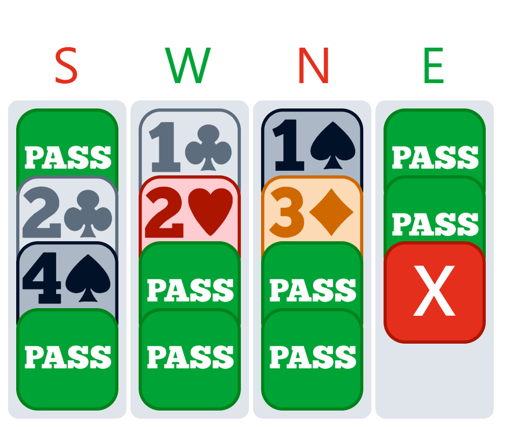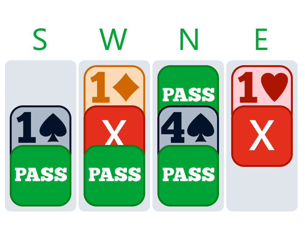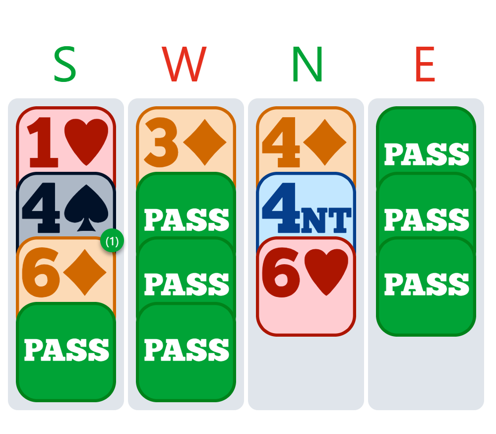 When the bidding escalates quickly, it can be hard to keep up. I was sitting South. The auction went:
