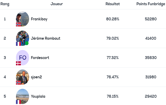 Vous avez été très nombreux à répondre présent pour le tournoi mensuel Funbridge : Le professeur de février 2022. Grâce à vous, ce tournoi a été une réussite. J’espère vous revoir aussi nombreux en mars !