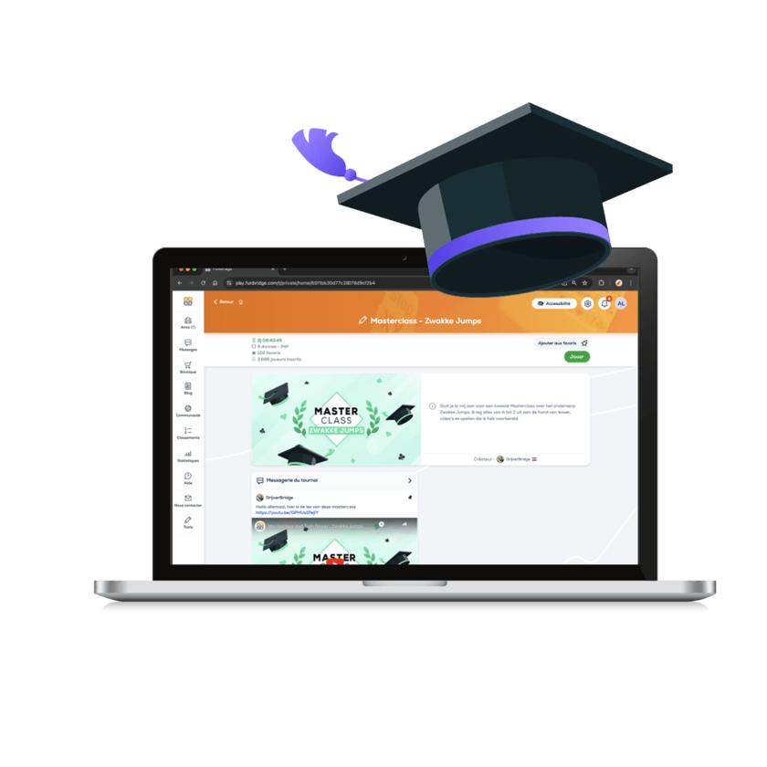 De regelmatig door bridgekampioenen (Tom Drijver, Dominique Fonteneau, India Natt, etc.) op Funbridge aangeboden masterclasses zijn een perfect voorbeeld van de veelzijdigheid van exclusieve toernooien. Deblokkeren, afgooien, troeven, slem, iedere masterclass biedt inzicht in een specifiek thema door middel van: