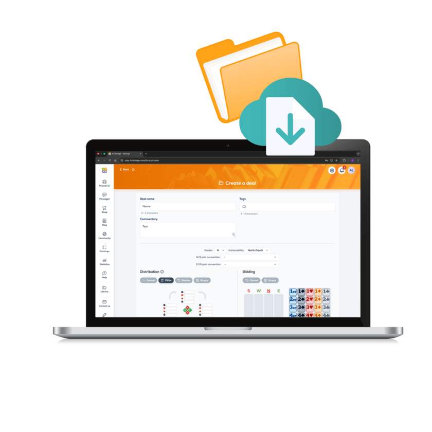 Accessible from the web version of Funbridge, the personal deal library is the ideal tool to prepare your lessons. Create or import your own deals, modify them freely (card exchanges, game rotations, imposed bids...), then save them for use in class.
