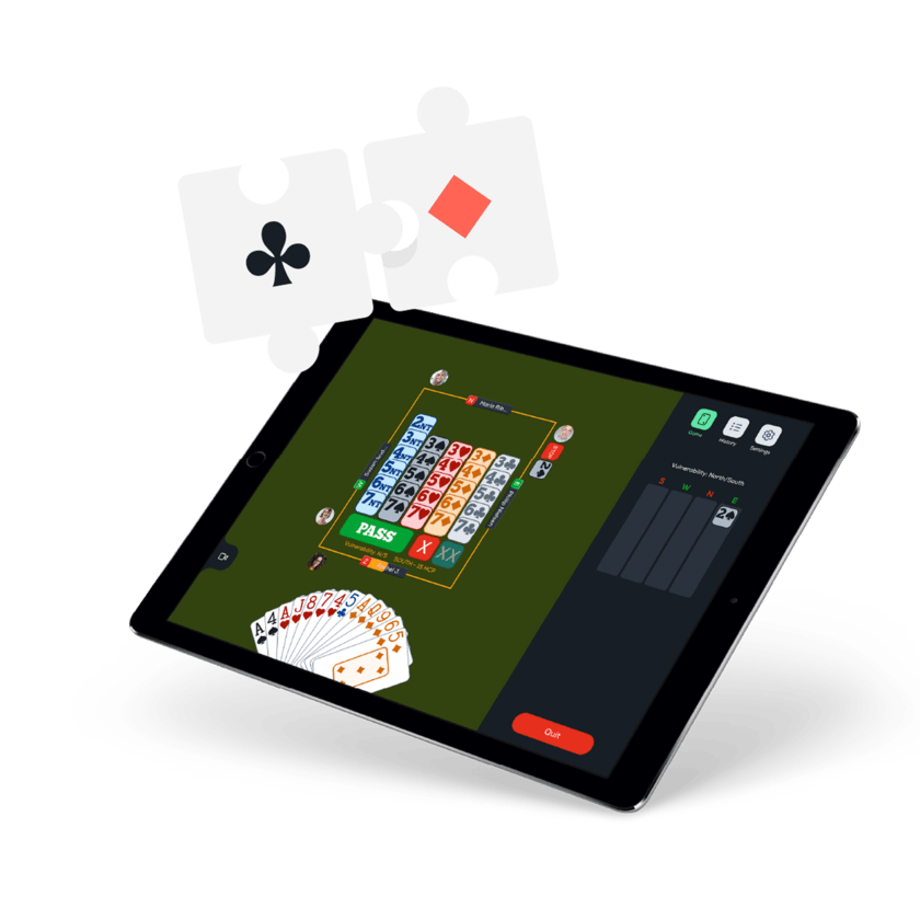 Our multiplayer game mode allows players to work on their communication with a partner or against other players live. It is even possible to play thematic deals in a « private table » mode: major fits, pre-emptive opening bid, slam bids…